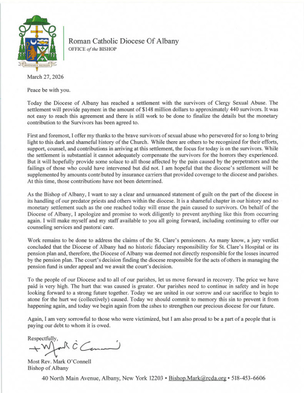 Albany, New York – The Roman Catholic Diocese of Albany, New York and the Official Committee of Tort Claimants announce today that they have reached a settlement agreement in the chapter 11 case filed in U.S. Bankruptcy Court in the Northern District of New York on March 15, 2023. The Diocese and the Tort Committee believe that this settlement is an important first step in forming a chapter 11 plan that will lead to the Diocese's exit from chapter 11. The settlement will provide payment in the amount of $148 million dollars to survivors of sexual abuse for acts perpetrated against them by clergy, religious, lay employees, and volunteers of the Diocese. Although the settlement amount remains subject to a creditor vote and court approval, the dollar figure of the settlement has been accepted by the Tort Committee. The Committee is comprised entirely of individuals who themselves survived sexual abuse when they were children
