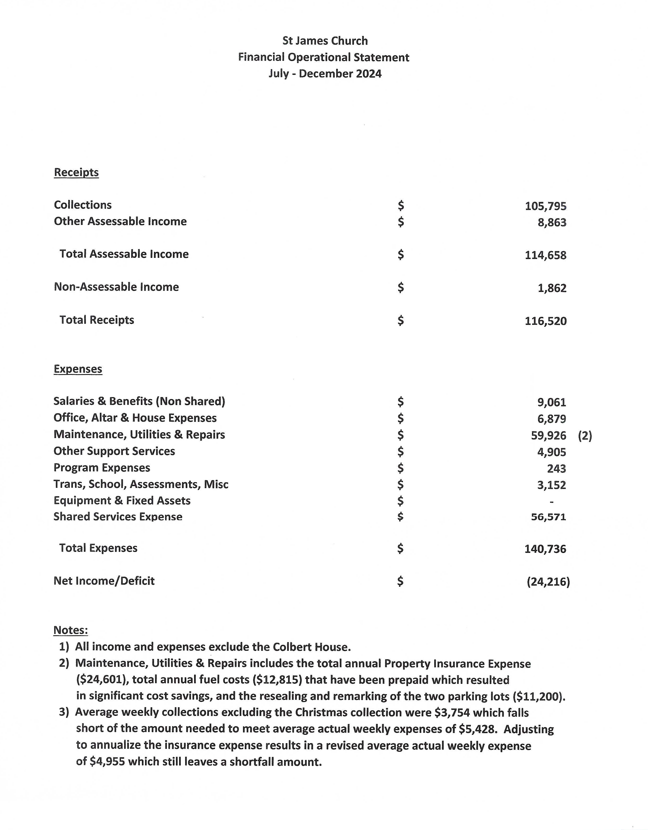 - The Church was required to fund the Diocesan Assessment shortfall totaling $2,666 in the current year.
